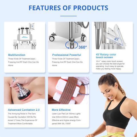 Description<p style="box-sizing: border-box; margin: 0px 0px 15px; color: rgb(13, 12, 12); font-family: "Open Sans", sans-serif; font-size: 14px;">Model: MS-7006FClinic Stubborn Fat Reduction Radio Frequency 160MW Lipo Laser 5 in 1 Machine Use<p style="box-sizing: border-box; margin: 0px 0px 15px; color: rgb(13, 12, 12); font-family: "Open Sans", sans-serif; font-size: 14px;">Introduce<p style="box-sizing: border-box; margin: 0px 0px 15px; color: rgb(13, 12, 12); font-family: "Open Sans", sans-serif; font-size: 14px;">Cool Fat Dissolve VacuumWhy the Cool Fat Dissolve Vacuum Procedure Is Different? It is the non-invasive cooling of adipose tissue to induceFat Dissolve - the breaking down of fat cells - to reduce body fat without damage to other tissues. It is fundamentally different from other non- or minimally invasive modalities. Other methods of fat removal primarily involve necrotic cell death by damaging fat with heat, high-intensity focused ultrasound, or chemical injections. Each approach poses potential technical challenges, particularly with respect to targeting the right tissue depth and unintended damage to other structures close to or within the fat layer. Predictability of efficacy using these other techniques isalso uncertain. In contrast, the Cool Fat Dissolve operation induces apoptosis only in fat cells to gently and gradually reduce the fat layer while preserving all other tissue. As triglyceride in fats will be converted into solid in particular low temperatures,It uses advanced cooling technology to selectively target fat bulges andeliminate fat cells through a gradual process that does not harm the surrounding tissues,reduce unwanted fat, When fat cells are exposed to precise cooling, they trigger a process of natural removal that gradually reduces the thickness of the fat layer. And The fat cells in the treated area are gently eliminated through the body's normal metabolism process, to eliminate unwanted fat. Radio Frequency Why do we use Radiofrequency and led Fat Dissolve at the same time? It uses 3Mhz RF Body And It is the Efficacy of Combined Skin Tightening and Fat Reduction. Combining led Fat Dissolve and radiofrequency is a logical approach to achieve skin tightening and fat reduction without . We explore the practicality and value of combining led Fat Dissolve and Tripolar radiofrequency to achieve skin tightening and localized fat reduction in the submental, neck, and jowl areas. Morbidity, patient acceptance, and patient satisfaction were assessed. 40K cavitation What is the Ultrasound Cavitation operation? It uses a 40kHz focused ultrasound cavitation effect, to cause tons of microscopic air bubbles to surround the LEDcyte (fat cell) membranes and with its resonant frequency, the bubbles cause a high enough to cause the fat cells to break up instantly. The brokenLEDcytes are then moved to the liver and safely metabolized out of human body which is assisted by drinking a lot of water. It produces cold slimming of fatty acids from adipocytes (fat-laden cells) due to a phenomenon known as stable cavitation, and increased cell permeability of the adipocytes. You get an increased flow of triglycerides. Furthermore, there is a breakdown of the fibers through mechanical action (jet stream). Finally, some content of adipocytes is metabolized by the liver and eliminated in the urine. How does 650NM Lipo Laser system work? It involves the application of a highly sensitive led to dissolve the fat deposits situated in the upper layers of the human skin. The energy emanating from the led breaks up the fat cells to produce an oily material. It penetrate into skin surface and stimulates the fat cell membranes,changing their permeability,the fat cells reduce their overall size and intracellular fat is released then the fatty trigly cerides flow out of the disrupted cell membranes and into the interstitial space,where they gradually passthrough the body's natural metabolic functions with no harmful physiological effects,this process is resulting in inch loss of patients.<p style="box-sizing: border-box; margin: 0px 0px 15px; color: rgb(13, 12, 12); font-family: "Open Sans", sans-serif; font-size: 14px;">Application <p style="box-sizing: border-box; margin: 0px 0px 15px; color: rgb(13, 12, 12); font-family: "Open Sans", sans-serif; font-size: 14px;">Intensive physical led to remove fat Excess fat cell melted Body slimming,cellulite reduction Smooth fatigue Remove obstruction from channels and collaterals Promote and accelerate the body’s metabolism<p style="box-sizing: border-box; margin: 0px 0px 15px; color: rgb(13, 12, 12); font-family: "Open Sans", sans-serif; font-size: 14px;">Package including<p style="box-sizing: border-box; margin: 0px 0px 15px; color: rgb(13, 12, 12); font-family: "Open Sans", sans-serif; font-size: 14px;">1 x Host maichine 1 x Cool Vacuum Head 1 x 40KHz Cavitation Head 1 x Sixpolar RF head for body 8 x Big 650NM lipo laser(each with 10 led light) 160MW 4 x Small 650NM lipo laser(each with 2 led light) 160mw 3 x Holders for All parts<p style="box-sizing: border-box; margin: 0px 0px 15px; color: rgb(13, 12, 12); font-family: "Open Sans", sans-serif; font-size: 14px;">Paramater<p style="box-sizing: border-box; margin: 0px 0px 15px; color: rgb(13, 12, 12); font-family: "Open Sans", sans-serif; font-size: 14px;">Rated input voltage:AC220V-240V 50HZ /AC110V-120V 60Hz Rated input power:350VA Cool cold slimming Vacuum Power:Up to 200W Cooling device output temperature:5~ -5°C Cooling device output :0-5Kpa Cooling liquid: pure water Cavitation frequency : 40KHz Cavitation Power:up to 60W Cavitation tip:60mm diameter RF for body RF frequency:3MHz RF power:up to 30W RF type:six polar with 100mw LED RF tip:65mm diameter Lipo Laser:635nm Lipo Laser power/Each diode:160mw led Pads:12 with 8 Large(8 Diode/Pad)+4 Small(2 Diode/Pad) ![]() ![]() ![]() ![]() ![]()
