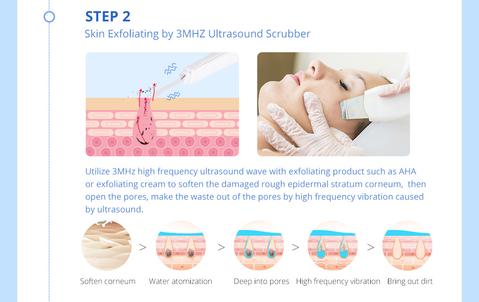 3MHZ ultrasound scrubber Utilize 3MHz high-frequency ultrasound wave with exfoliating products such as AHA or exfoliating cream to soften the damaged rough epidermal stratum corneum, then open the pores, make the waste out of the pores by high-frequency vibration caused by ultrasound.